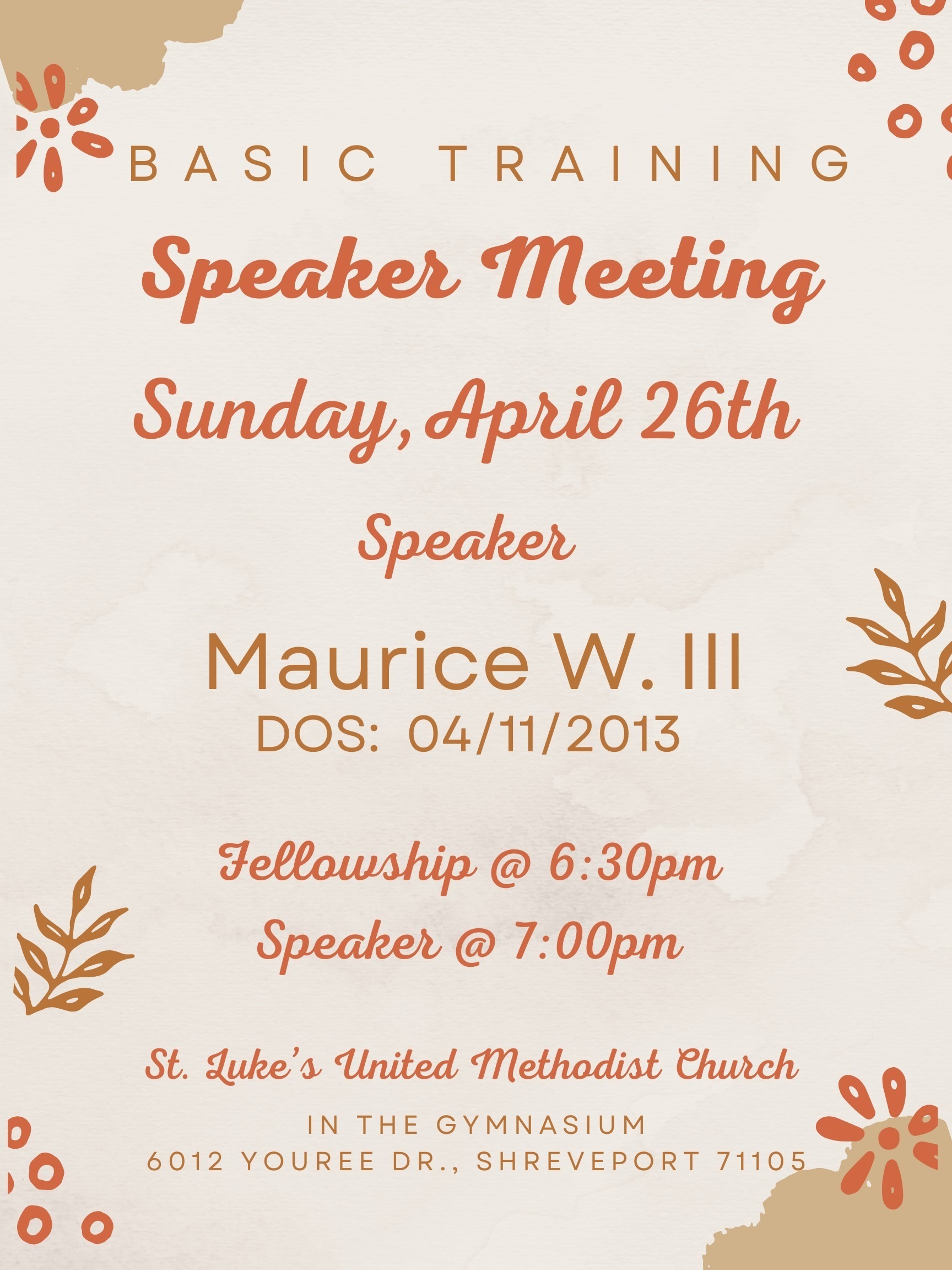 « All Events Basic Training Speaker Meeting April 26 @ 6:30 pm - 8:00 pm « Beavers Bend Round Robin Half Past Five Monthly Speaker Meeting » Add to calendar Google Calendar iCalendar Outlook 365 Outlook Live Details Date: April 26 Time: 6:30 pm - 8:00 pm Organizer Basic Training Venue St. Lukes United Methodist Church 6012 Youree Drive Shreveport, LA 71105 United States + Google Map