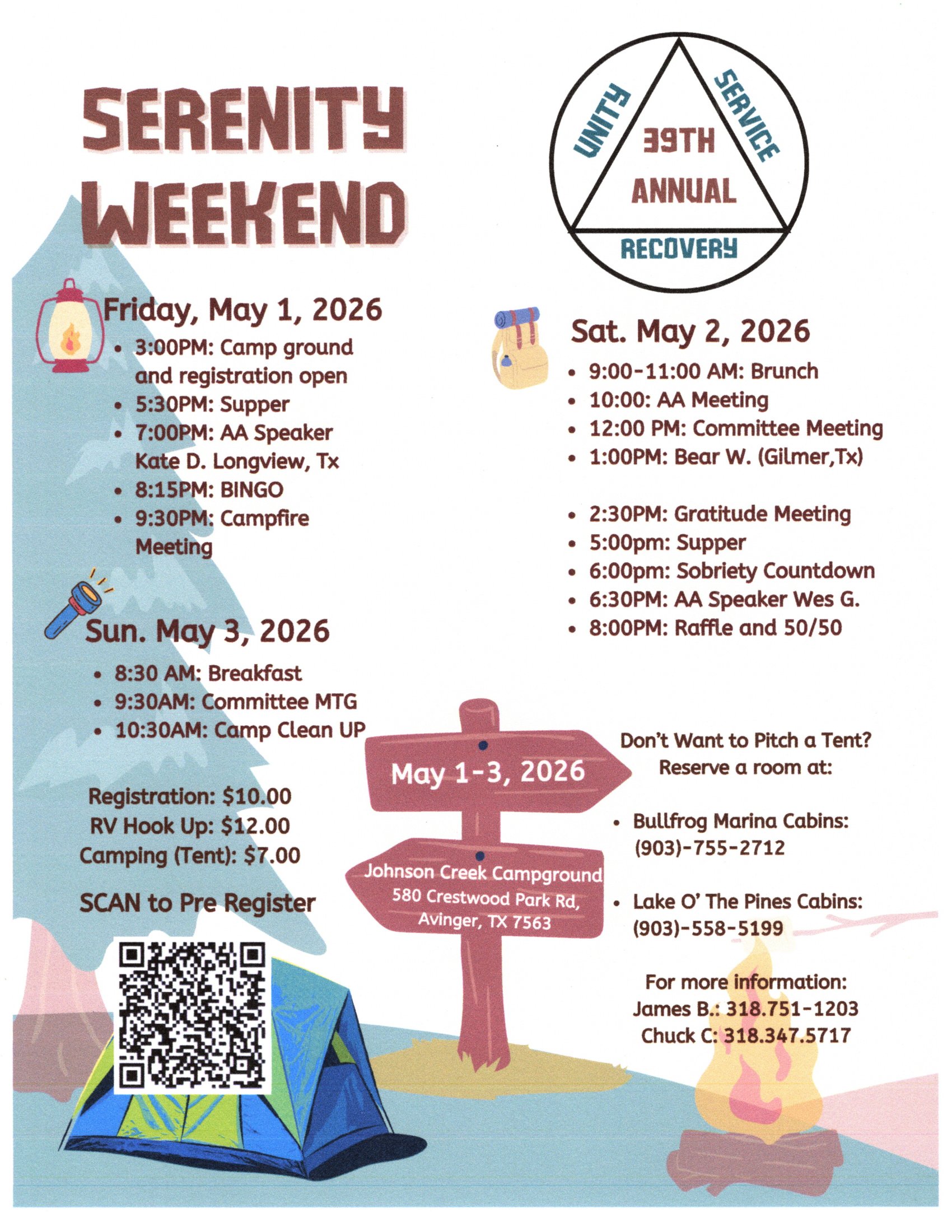 « All Events Serenity Weekend May 1 @ 3:00 pm - May 3 @ 11:00 am « Half Past Five Monthly Speaker Meeting Women in Recovery Retreat » Add to calendar Google Calendar iCalendar Outlook 365 Outlook Live Details Start: May 1 @ 3:00 pm End: May 3 @ 11:00 am Organizer Serenity Weekend Venue Lake O’ Pines Johnson Creek Group Campground 2669 FM 726 Jefferson, TX 75657 United States + Google Map Phone (903)755-2205