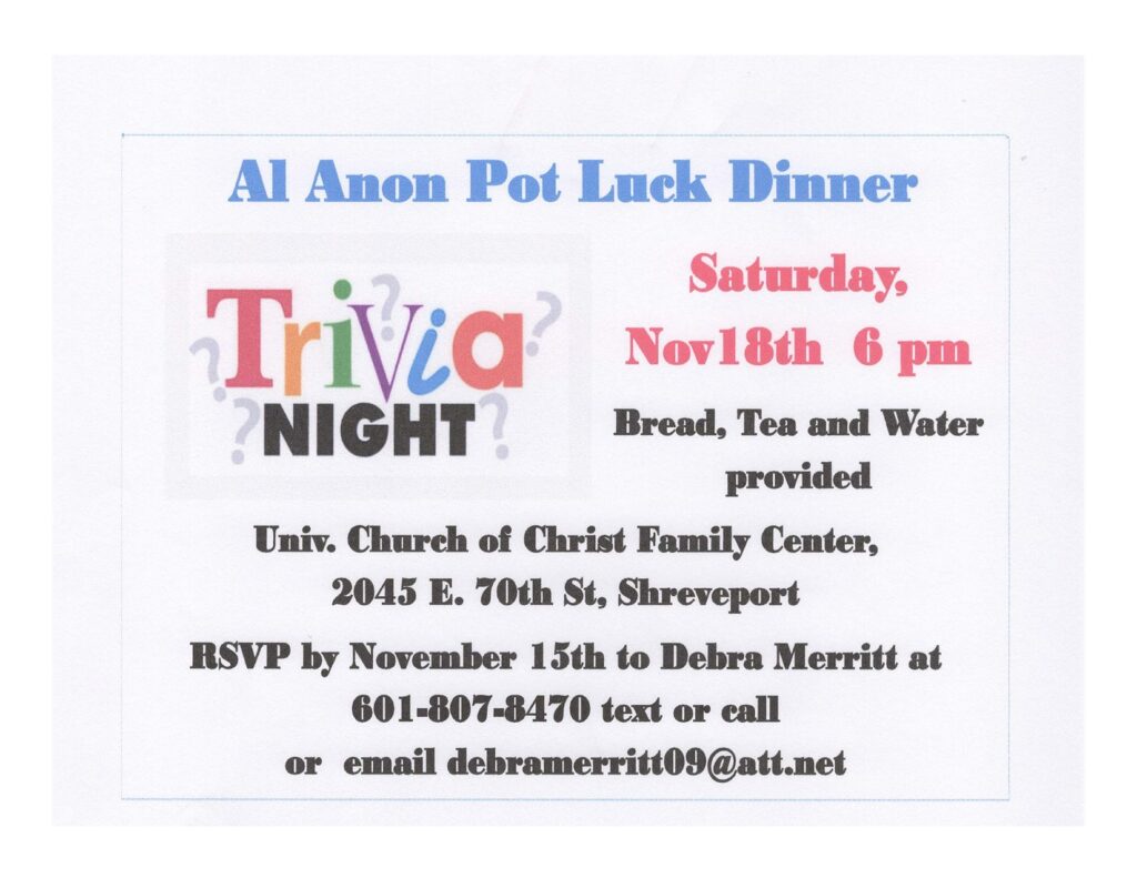 « All Events This event has passed. November 18, 2023 @ 6:00 pm - 9:00 pm « Men In Recovery Fall Retreat 2023 State Line Group of Waskom Eating Meeting » Add to calendar Google Calendar iCalendar Outlook 365 Outlook Live Details Date: November 18, 2023 Time: 6:00 pm - 9:00 pm Venue Universary Church of Christ Family Center 2045 E. 70th St. Shreveport, 71105 United States + Google Map