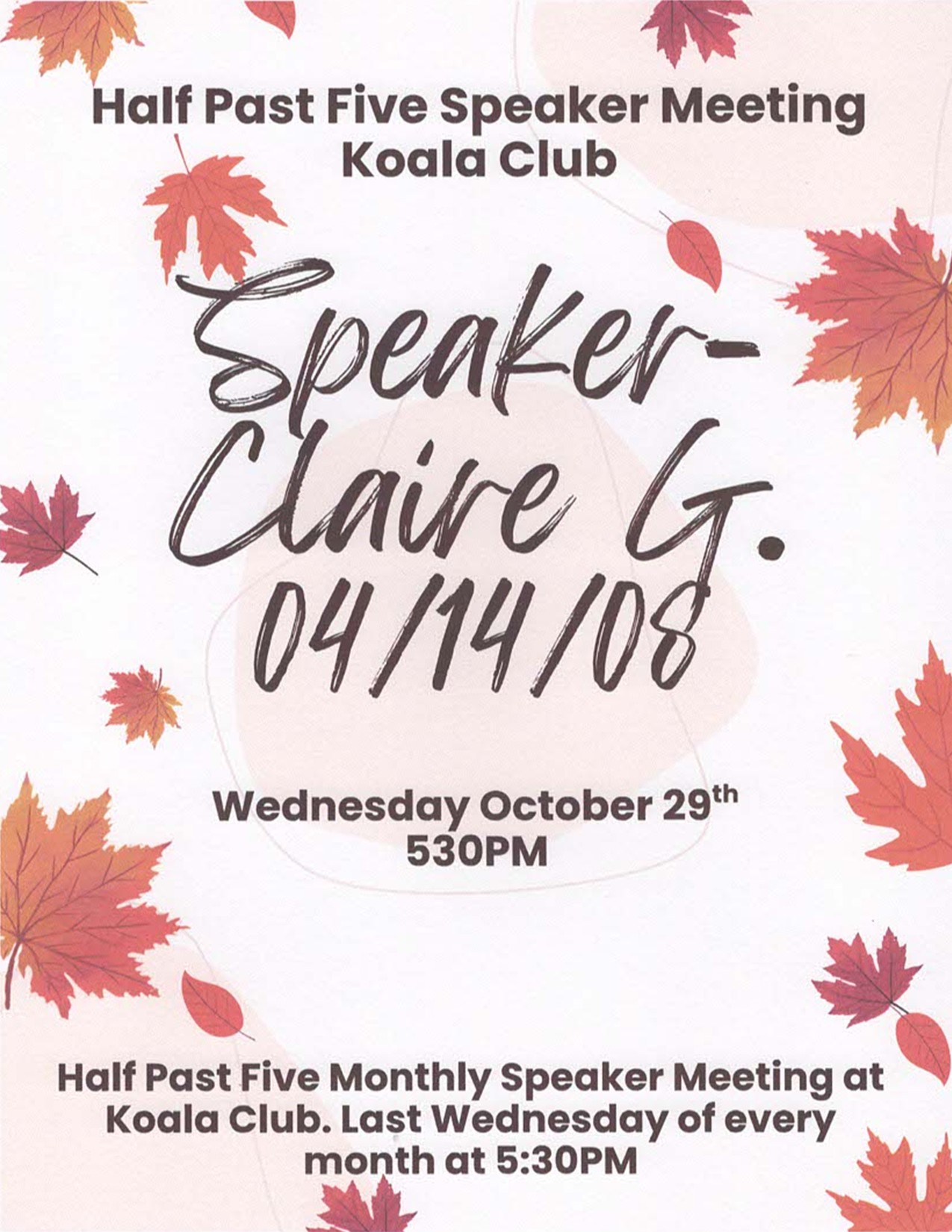 « All Events Half Past Five Monthly Speaker Meeting October 29 @ 5:30 pm - 6:30 pm « Basic Training Sweets & a Speaker 78th Tri-State Convention » Add to calendar Google Calendar iCalendar Outlook 365 Outlook Live Details Date: October 29 Time: 5:30 pm - 6:30 pm Organizer Half Past Five Venue KOALA Club 4809 Shed Rd. Bossier City, LA 71111 + Google Map Phone (318) 747-0411