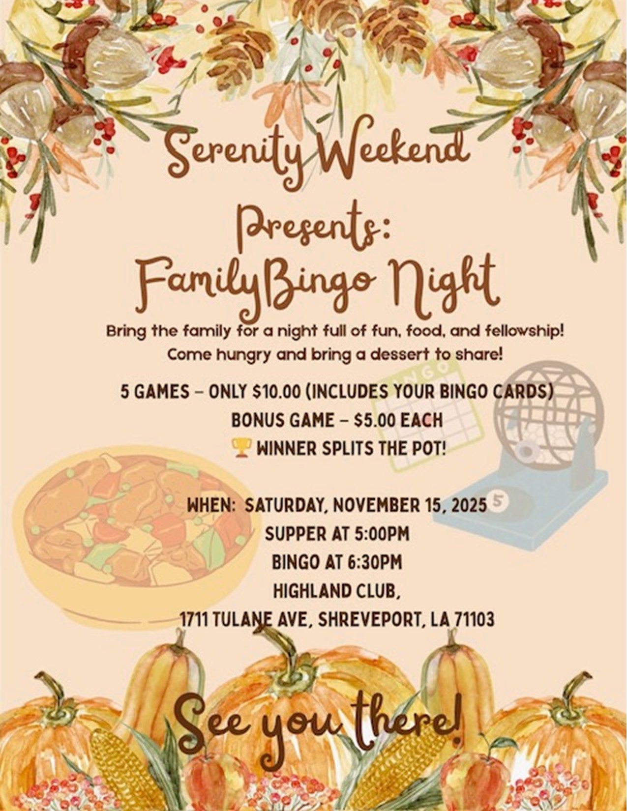 « All Events Serenity Weekend Presents FAMILY BINGO NIGHT November 15 @ 5:00 pm - 9:00 pm « SHREVYPAA Presents HAVE A BALL IN FALL Half Past Five Monthly Speaker Meeting » Add to calendar Google Calendar iCalendar Outlook 365 Outlook Live Details Date: November 15 Time: 5:00 pm - 9:00 pm Organizer Serenity Weekend Venue Highland Club 1711 Tulane Ave Shreveport,, LA 71103 + Google Map Phone (318) 636-9388 View Venue Website