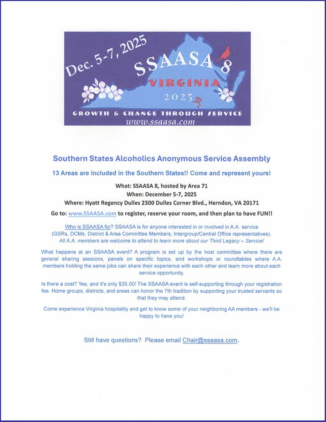 « All Events SSAASA 8- Growth & Change Through Service December 5 @ 5:30 pm - December 7 @ 12:00 pm « Women in Recovery Retreat 44th Annual Winter Holiday » Add to calendar Google Calendar iCalendar Outlook 365 Outlook Live Details Start: December 5 @ 5:30 pm End: December 7 @ 12:00 pm Organizer SSAASA- Southern States AA Service Assembly View Organizer Website Venue Hyartt Regency Dulles 2300 Dulles Corner Blvd. Herndon, VA 20171 United States + Google Map